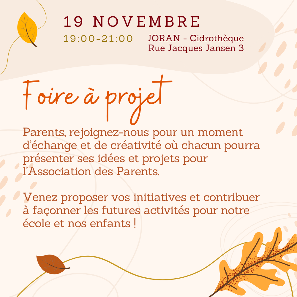 Parents, rejoignez-nous pour un moment d’échange et de créativité où chacun pourra présenter ses idées et projets pour l’Association des Parents.